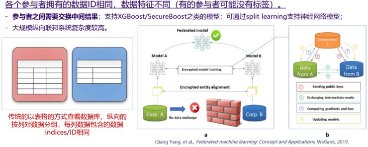 纵向联邦加密,大家的Feature不一样,一个机构红色、一个机构蓝色,大家可以想象两个医院,一个病人在红色医院做一些检测,在蓝色的医院做另外一些检测,当我们知道这两个医院有同样一群病人,他们不愿意直接交换数据的情况下,有没有办法联合建模?