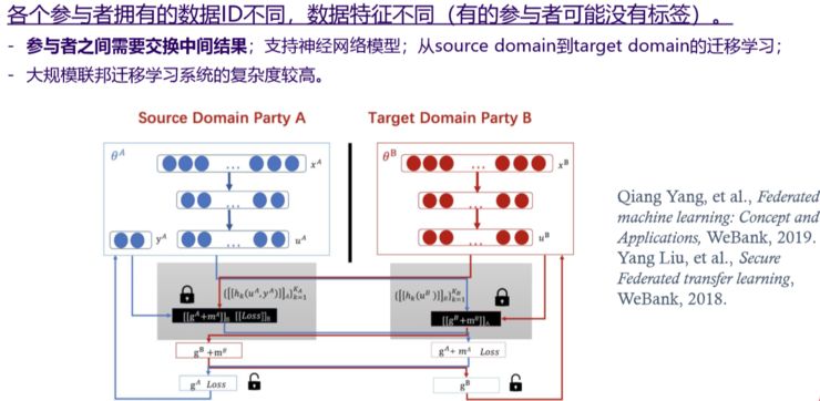 在另外的空间可以发现他们的子空间是有交互的,这些子空间的交互就可以进行迁移学习。虽然他们没有直接的特征和用户的重合,我们还是可以找到共性进行迁移学习,这种叫联邦迁移学习。