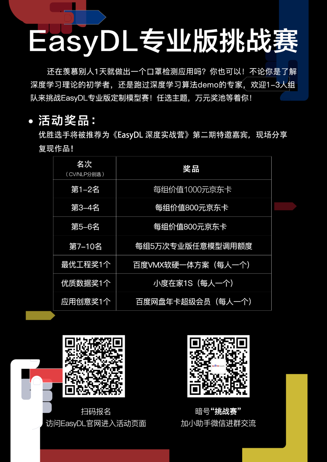 1 天上线一个文本分类模型?1周定制开发一个垂直领域的智能客服系统?从不可能到可能,你也可以!为了让更多开发者感受AI的魅力,百度EasyDL平台正式开启专业版定制模型挑战赛,选手可以通过对实际生活与业务需求的细微观察入手,基于百度EasyDL专业版功能,创造出价值卓群的模型。以下是NLP组选题推荐,选手可以根据自己的需求任选命题或者自主命题,定制模型参赛: