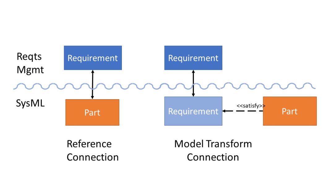 另一种方法是图3右侧,模型变换连接(Model Transform Connection),变换Jama或DOORS NG里的需求为对等的SysML需求,并维护两者之间的连接。