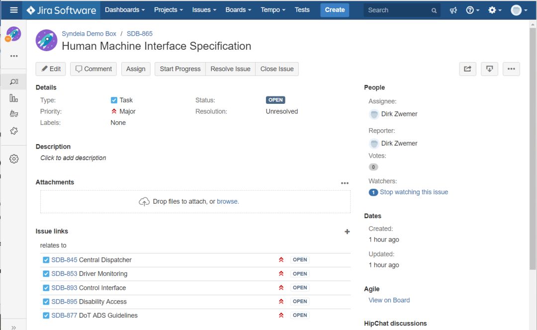 再次使用Syndeia,我们使用SysML需求结构生成JIRA条目的集合,每条需求一条。图8展示了中层的需求规约。每条需求的JIRA条目可以用于项目管理,例如跟踪状态、安排进度和分配人员。本例中使用了引用连接,在SysML需求和JIRA条目之间没有共同的属性。然而,连接允许系统工程师在web浏览器中直接打开SysML模型元素或元素符号的JIRA条目,并为Jama仓储提供间接的反向链接。使用这些连接,我们就完成了图2中TSM架构左侧的工作。