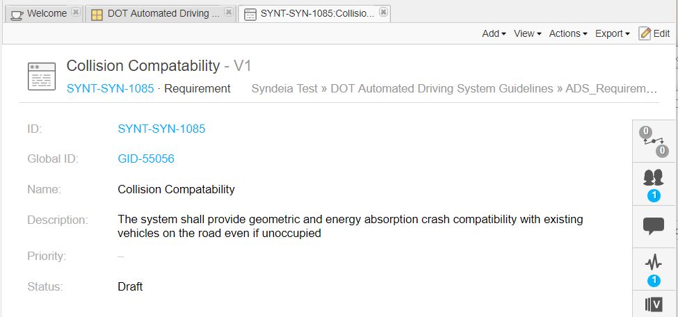 我们假设需求一开始在需求管理工具中生成。图6展示了创建自US DoT(美国交通部)报告, "Automated Driving System 2.0: A Vision for Safety" (September 2017)的部分需求列表。在Jama中被捕获为多层需求模型。每条捕获进Jama的需求都有Name(名称), ID, Description(描述)和其他属性。图7展示了Jama web浏览器中的需求。注意:DoT报告是建议指南的集合,不是强制的需求,此处只是为了展示。