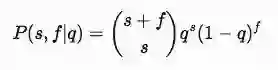 从这个公式中我们需要进一步计算P(s,f|q) 和 P(q),其中 P(s,f|q)的含义是基于摇臂的胜率q,在s+f次实验中获胜s次的概率。这里我们可以用二项式分布【14】来计算一系列独立实验后获胜的次数,公式如下:
