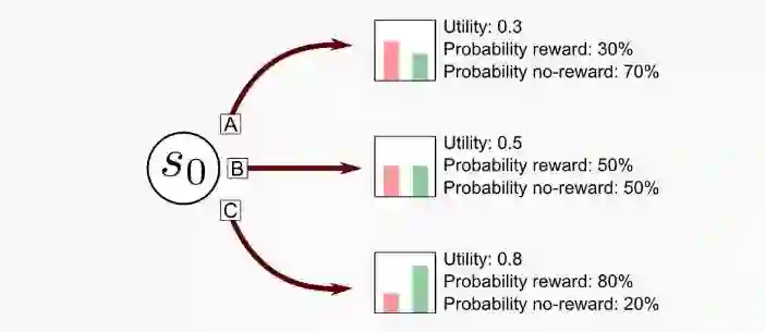 实验部分我们以N=3为例,并且设定老虎机的回报满足伯努利分布【3】,即回报结果为0/1. 在初始状态S0时,三个摇臂(A、B、C)每次回报为1的概率分别是30%, 50%和80%.