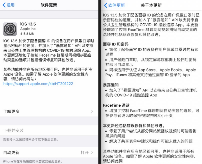 苹果发布iOS 13.5正式版:优化戴口罩解锁手机的方式