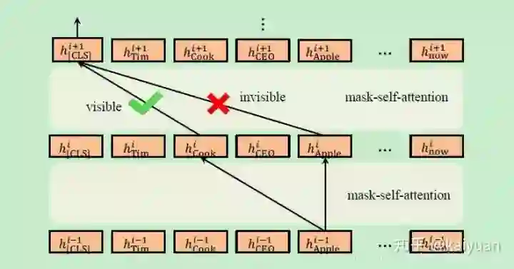 BERT中的Transformer Encoder不能接受上述可见矩阵作为输入,因此需要稍作改进。Mask-Transformer是一层层mask-self-attention的堆叠,