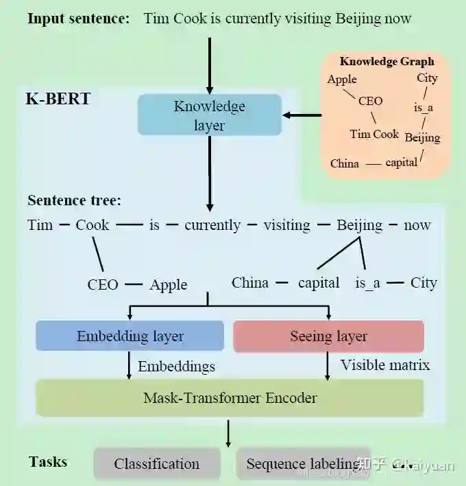 Okay,理解了大致思想之后我们来分析具体的实现方式。模型的整体框架如下图,主要包括了四个子模块: knowledge layer, embedding layer, seeing layer 和 mask-transformer。对于一个给定的输入 ,首先 knowledge layer会从一个KG中注入相关的三元组,将原来的句子转换成一个knowledge-rich的句子树;接着句子树被同时送入embedding layer和seeing layer生成一个token级别的embedding表示和一个可见矩阵(visible matrix);最后通过mask-transformer层编码后用于下游任务的输出。