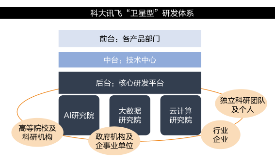 智能语音和人工智能技术研发难度大、进入壁垒高,高额的研发投入只是企业取得源头技术突破的“必要不充分条件”,企业致胜的关键在于能否构建并维持一支专家型团队进行长期攻关,并配套以高效的研究成果转化机制。为此,科大讯飞一方面围绕其三大研究院构建企业自身的核心研发平台,另一方面从源头整合外部行业研发资源,通过与高校及科研机构、政府机构及企事业单位、行业企业、独立科研团队以共建联合实验室等形式展开合作,构建出了一套特殊的“卫星型”研发体系。