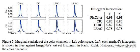 Lab颜色空间中的颜色通道的边缘统计数据。左:每种测试方法的直方图以蓝色显示,ImageNet的测试数据集直方图以黑色显示。右图:左图颜色通道的相交比例