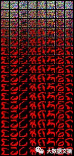 起初我的想法是,因为这个模型不需要像GAN那么复杂的架构设计,所以应该会极大地降低训练的难度。而事实上,这个模型在MNIST数据集上的确输出了不错的结果,如下栏所示:每一纵列都是由噪音图片一步步推进成为红色的MNIST数值。
