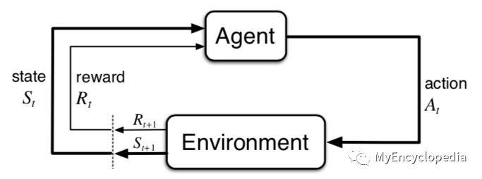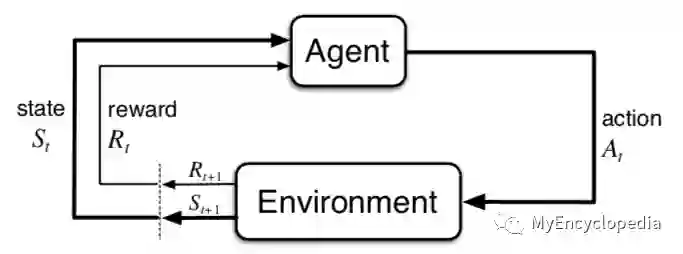 先来回顾一下强化学习的建模基础:有限马尔可夫决策过程(Finite Markov Decision Process, Finite MDP)。如下图,强化学习模型将世界抽象成两个实体,强化学习解决目标的主体Agent和其他外部环境。它们之间的交互过程遵从有限马尔可夫决策过程:若Agent在t时间步骤时处于状态 ,采取动作 ,然后环境根据自身机制,产生Reward 并将Agent状态变为 。