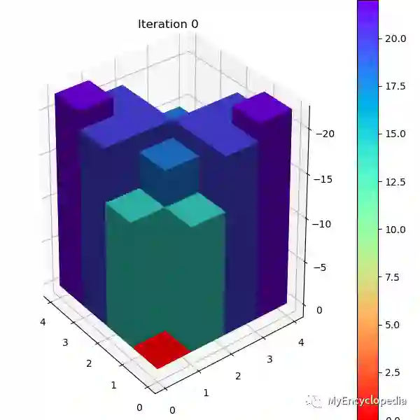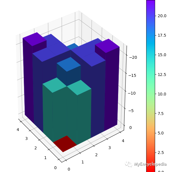 在3D V值图中可以发现,由于是随机选择方向的策略, Agent在每个格子的V值绝对数值要比最佳V值大,意味着随机策略下Agent在Grid World会得到更多的负reward。