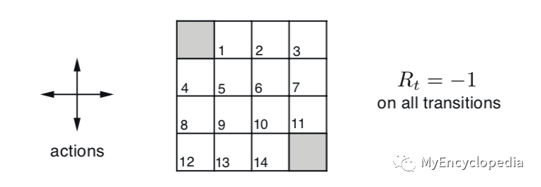 以Grid World为例,当Agent处于编号1的网格时,可以往四个方向走,往任意方向走都只产生一种 S, R,因为这个简单的游戏是确定性的,不存在某一动作导致stochastic状态。例如,在1号网格往左就到了终点网格(编号0),得到Reward -1这个规则可以如下表示