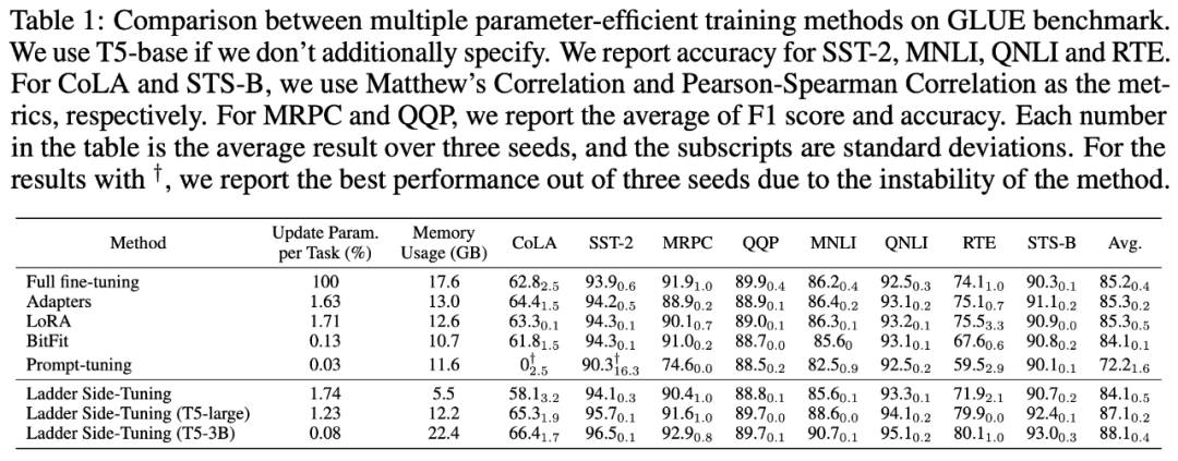 原论文做了不少 LST 的实验,包括 NLP、CV 的,下面是 LST 在 GLUE 数据集上的效果:
