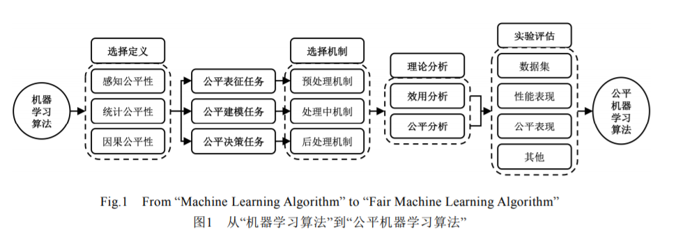 在政府机构指导性原则引导下,学术界和产业界正着力推动公平机器学习理论、技术及应用发展.本文的 主旨是梳理目前机器学习公平性研究的现状,并为后续研究提供可借鉴的思路.机器学习算法通常包括以下关 键环节:数据所有者采集数据,模型提供者设计算法,算法使用者运行并做出决策.公平机器学习研究的关键问 题是如何建立以法律、伦理、社会学为引导的公平性定义,以及如何设计公平性定义驱动的公平机器学习算 法.图 1总体介绍公平机器学习算法设计流程框架.首先,明确公平目标,即确定符合应用需求的公平性目标,常用 的公平性目标包括感知公平性、统计公平性和因果公平性.其次,明确公平任务,即确定面向公平目标的算法公 平性提升任务,包括公平表征任务、公平建模任务和公平决策任务.公平表征任务旨在建立公平数据集或提取 公平数据特征;公平建模任务旨在建立公平机器学习模型;而公平决策任务将机器学习模型视为黑盒模型,旨在 利用其输出结果进行公平决策.处理机制的选择通常对应机器学习算法关键环节,具体包括预处理机制、处理 中机制和后处理机制.最后,从理论分析和实验评估两个角度分别验证公平机器学习的表现.本文的主要贡献如 下:明确公平机器学习算法设计流程框架,形式化公平性定义,给出公平性定义的分类体系,总结并综述三类公 平性任务,系统性梳理未来研究方向,有助于指导后续研究者针对公平性理论的研究和探索.本文的框架组织如 下:第1章列举算法不公平产生的危害,探讨造成该现象的潜在原因,提供消除算法偏差的机制;第0章提取机器 学习中公平性定义的抽象模型,比较现有机器学习的公平性定义;第0章详述解决公平表征任务、公平建模任 务和公平决策任务的具体方法;第4章举例说明公平机器学习的应用,并列举供研究的数据集和检测工具;第5章 指出公平机器学习的研究问题及其面临的挑战;第6章对全文进行总结.