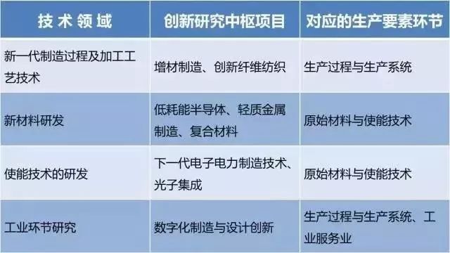 在第四次工业革命的战略布局方面,美国白宫在2012年3月提出了“国家制造创新网络计划”,在制造业的4大领域建立9个研究创新中枢(如下图)。