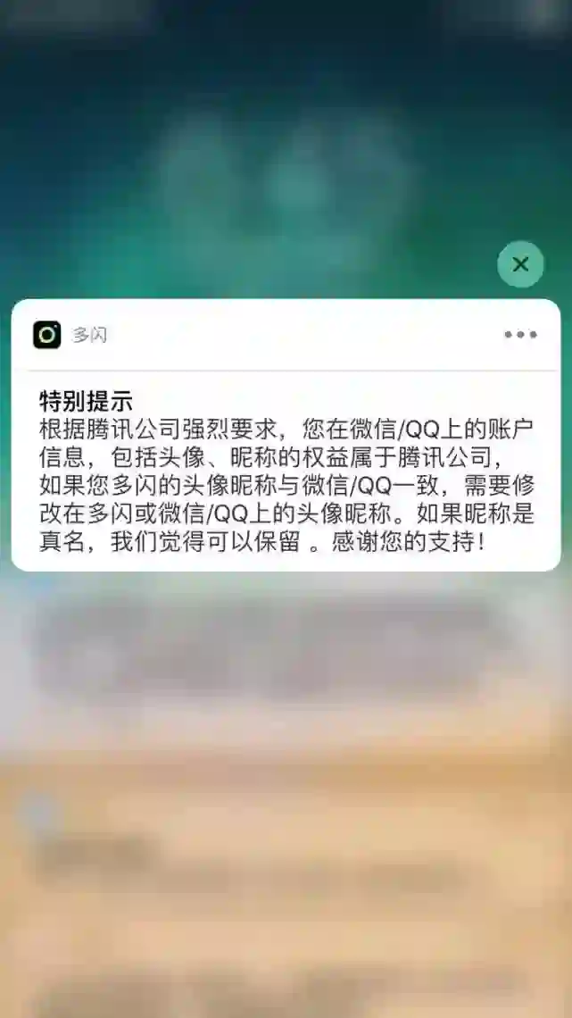 3月19日,多闪通过弹窗通知用户,称腾讯禁止多闪使用用户本人的微信昵称和头像:“根据腾讯公司强烈要求,您在微信QQ上的账户信息,包括头像、昵称的权益属于腾讯公司,如果您多闪的头像昵称与微信QQ一致,需要修改在多闪或微信/QQ上的头像昵称。如果昵称是真名,我们觉得可以保留。感谢您的支持!”