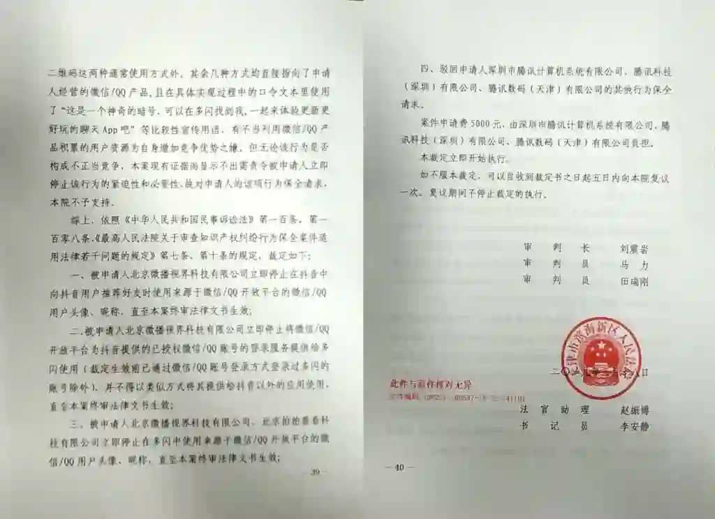 (二)北京微播视界科技有限公司立刻停止将微信/QQ开放平台为抖音提供的已授权微信/QQ的登录服务提供给多闪使用(裁定生效前已通过微信/QQ账号登录过多闪的账号除外),并不得以类似方式将其提供给抖音以外的应用使用,直至本案终审法律文书生效;