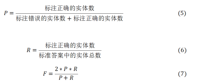 用F值评价模型的标注效果,具体做法是将已标注结果视为标准答案,计算所有测试文档中识别正确的实体数、标注错误的实体数与标准答案中的实体总数,计算准确率(P)和召回率(R),进而计算F值,计算方法如公式(5)-(7):