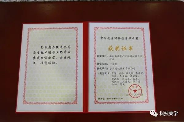 近日小米集团和中广核工程有限公司、中国运载火箭技术研究院等一同获得了中国质量协会质量技术奖一等奖。这是我国质量技术领域最高奖,今年参选成果有一千余项,最终5家单位获一等奖,小米是唯一也是首家互联网公司获此殊荣。