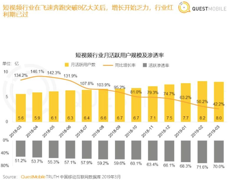 随着移动互联网整体增速放缓,短视频也开始有些乏力。在《中国移动互联网2019春季大报告》中,QuestMobile认为短视频“行业红利期已过”。2019年3月,短视频行业MAU同比增幅只有一年前的1/3,环比甚至出现了过去12个月里的第一次下滑。