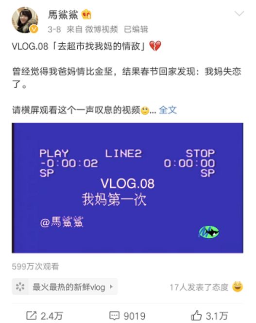 在微博上发了《去超市找我妈的情敌》这个视频后,“馬鯊鯊”的粉丝一天里增长了10倍。这个视频在微博的播放量达到600万次,并获得多位大V的转发。这是“馬鯊鯊”的第8个Vlog。在此之前,她的Vlog在微博上最高的播放量是单集30万次。