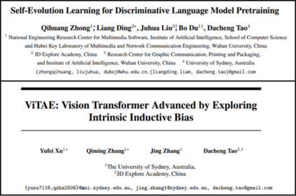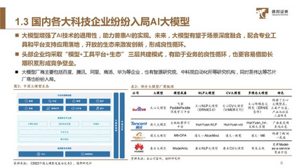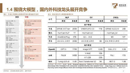 图注:(上)2022年京东探索研究院发表论文《Self-Evolution Learning for Discriminative Language Model Pretraining》,提出自我进化学习方法,为vega v2大模型的设计提供核心思想; (下)2021年京东探索研究院发表论文《ViTAE: Vision Transformer Advanced by Exploring Intrinsic Inductive Bias》,尝试将 CNN和transformer相结合。 因此,国内公司的 AI 大模型研发虽然比国外公司晚,但是发展却异常地迅速,其内在逻辑便是:本土企业和学者对深度学习技术的深入理解与创新。在大模型的底层技术已经固定的时代,他们靠着持续的探索和努力才能构建出秀丽的“上层建筑”。 在OpenAI发布ChatGPT之前,国内的一些企业就已经押注AI大模型技术:例如2021 年 4 月,华为云联合循环智能发布盘古超大规模预训练语言模型,参数规模达 1 000 亿;2021 年 6 月,北京智源人工智能研究院发布了超大规模智能模型“悟道 2.0”,参数规模达到 1.75 万亿;2021 年 12 月,百度推出 ERNIE 3.0 Titan 模型,参数规模达 2 600 亿,同期,阿里巴巴达摩院的 M6 模型参数达到 10 万亿,将大模型参数直接提升了一个量级。 到2023年,大模型继续火热,国内的AI大模型团队已逐渐拓展到视觉、决策领域,甚至用于解决蛋白质预测、航天等领域的重大科学问题,阿里、京东、oppo等大厂都有相应的成果。 ** PART 2**