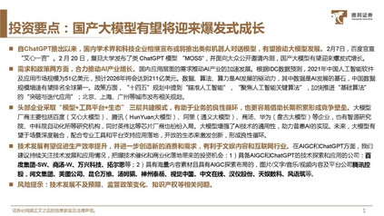 自ChatGPT推出以来,国内学术界和科技企业相继宣布或将推出类似机器人对话模型,有望推动大模型发展。2月7日,百度官宣“文心一言”。2月20日,复旦大学发布了类ChatGPT模型“MOSS”,并面向大众公开邀请内测,国产大模型有望迎来爆发式增长。 需求和政策两方面,合力推动AI产业增长。国内应用层面的需求推动AI产业的加速发展。根据IDC数据预测,2021年中国人工智能软件及应用市场规模为51亿美元,预计2026年将会达到211亿美元。数据、算法、算力是AI发展的驱动力,其中数据是AI发展的基石,中国数据规模增速有望排名全球第一。政策方面,“十四五”规划中提到“瞄准人工智能”,“聚焦人工智能关键算法”,加快推进“基础算法”的“突破与迭代应用”;北京、上海、广州等城市发布相关规划。 头部企业采取“模型+工具平台+生态”三层共建模式,有助于业务的良性循环,也更容易借助长期积累形成竞争壁垒。大模型厂商主要包括百度(文心大模型)、腾讯(HunYuan大模型)、阿里(通义大模型)、商汤、华为(盘古大模型)等企业,也有智源研究院、中科院自动化所等研究机构,同时英伟达等芯片厂商也纷纷入局。大模型增强了AI技术的通用性,助力普惠AI的实现。未来,大模型有望于场景深度融合,配合专业工具和平台支持应用落地,开放的生态来激发创新,形成良性循环。 技术发展有望促进生产效率提升,并进一步创造新的消费和需求,有利于文娱内容和互联网行业。在AIGC和ChatGPT方面,我们建议持续关注技术发展和应用情况,把握技术催化和商业化落地带来的投资机会:1)具备AIGC和ChatGPT的技术探索和应用的公司:百度集团-SW、商汤-W、万兴科技、拓尔思等;2)具有海量内容素材且具有AIGC探索布局的,图片/文字/音乐/视频内容及平台公司腾讯控股,阅文集团、美图公司、昆仑万维、汤姆猫、神州泰岳、视觉中国、中文在线、汉仪股份、天娱数科、风语筑等。