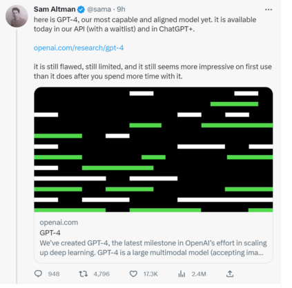 GPT-4来了!今日凌晨,万众瞩目的大型多模态模型GPT-4正式发布! OpenAI CEO Sam Altman直接介绍说: