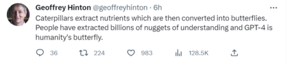 图灵奖三巨头之一Geoffrey Hinton对此赞叹不已,「毛虫吸取了营养之后,就会化茧为蝶。而人类提取了数十亿个理解的金块,GPT-4,就是人类的蝴蝶。」