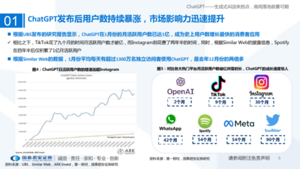 据统计,ChatGPT日活跃用户数的增速远超Instagram,1月份平均每天有超过1300万名独立访问者使用ChatGPT,是去年12月份的两倍多;国内外科技巨头都非常重视ChatGPT引发的科技浪潮,积极布局生成式AI,国内厂商(百度、腾讯等)也高度关注ChatGPT,积极探索前沿技术,相关深度应用也即将推出。