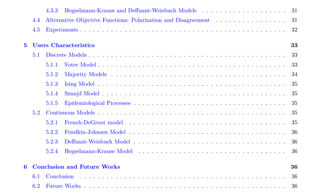 第3节:收敛特性。 可以说,观点动力学中研究最为深入的方面是其收敛特性:过程需要多长时间达到一个“最终”配置?这种最终配置是什么样的?我们回顾了所研究模型的收敛特性方面的关键发现。利用马尔可夫链分析和谱图理论等数学技术,以及实验分析和前人工作(例如[8,9]),前人研究了不同模型的收敛特性。我们回顾了关键发现,包括关于模型收敛时间的、基于图和模型参数的各种界限,并强调了一些现有研究中的重要空白。 第4节:病毒式营销。 应该让哪些用户子集采纳特定观点,以触发其在社交网络中的广泛传播?这个基本问题,是病毒式营销和政治竞选等应用的核心,已在观点动力学的框架下得到广泛研究。在此背景下出现了几种问题表述:(i)优化问题: 给定预算k,应选择哪k个个体采纳该观点以最大化其传播范围?(ii)组合问题: 使一种观点变得“病毒式”传播所需的最小初始采纳者数量,其理论界限是什么(用图和模型参数表示)?(iii)概率问题: 若每个用户以概率p独立采纳该观点,多大(最小)的概率p可能引发病毒式级联效应? 为了解答这些问题,研究者利用了来自网络科学、图论、优化、机器学习、概率论和组合学的工具。前人工作(例如[1])为这些表述提出了算法解决方案和理论界限。这些方法通常使用来自Facebook和Twitter等平台的真实世界数据集进行实证评估。 在本综述中,我们对与观点病毒性相关的主要问题表述进行了结构化分类。我们总结了关键的理论结果,强调了不同观点动力学模型中最先进的算法,并回顾了关键的实证分析。 第5节:用户特征。 大多数观点动力学模型中一个常见的简化是假设所有用户行为相同。为了应对这一局限性,越来越多的研究(例如[10])专注于理解个体用户特征,如顽固性、不可知论或逆反心理,如何影响观点扩散。这些研究表明,用户行为的异质性能够显著改变观点形成的动态过程和结果。我们回顾了该领域的关键进展,特别强调用户特质如何影响诸如极化现象、精英群体在社会环境中的影响力,以及流行病学模型中有效疫苗接种策略的设计等问题。
