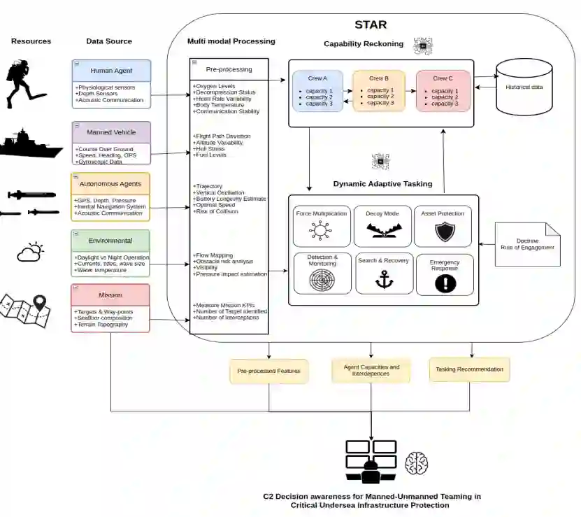 无人系统在各领域的日益融合正在重塑军事行动,从规划到任务执行。北约在训练演习中展示出兴趣,其中混合有人-无人团队的同步至关重要。STAR是一个人工智能驱动的任务工具,旨在在有人和无人系统间分配任务,支持协调多域作战的规划、任务分配、协调和执行。STAR集成了多模态数据,执行能力评估,并向具有人工监督的指挥控制系统提供基于人工智能的任务分配建议。通过如Unreal Engine、Cesium三维地理空间建模和JSBSim飞行动力学等建模与仿真环境,STAR能够实现高保真度的任务执行,包括模拟代表性有人和无人载具及其适当的资产和基于人工智能的能力,应用于诸如水下保护、海陆空作战或搜救等逼真场景。STAR实现了人机交互,同时允许C2操作员验证或否决任务分配建议。STAR通过使用机器学习模型实现了高达89%的任务分配准确率,显示出提高任务准备状态,并增强联合多域作战中的协调、互操作性和效果同步的潜力。