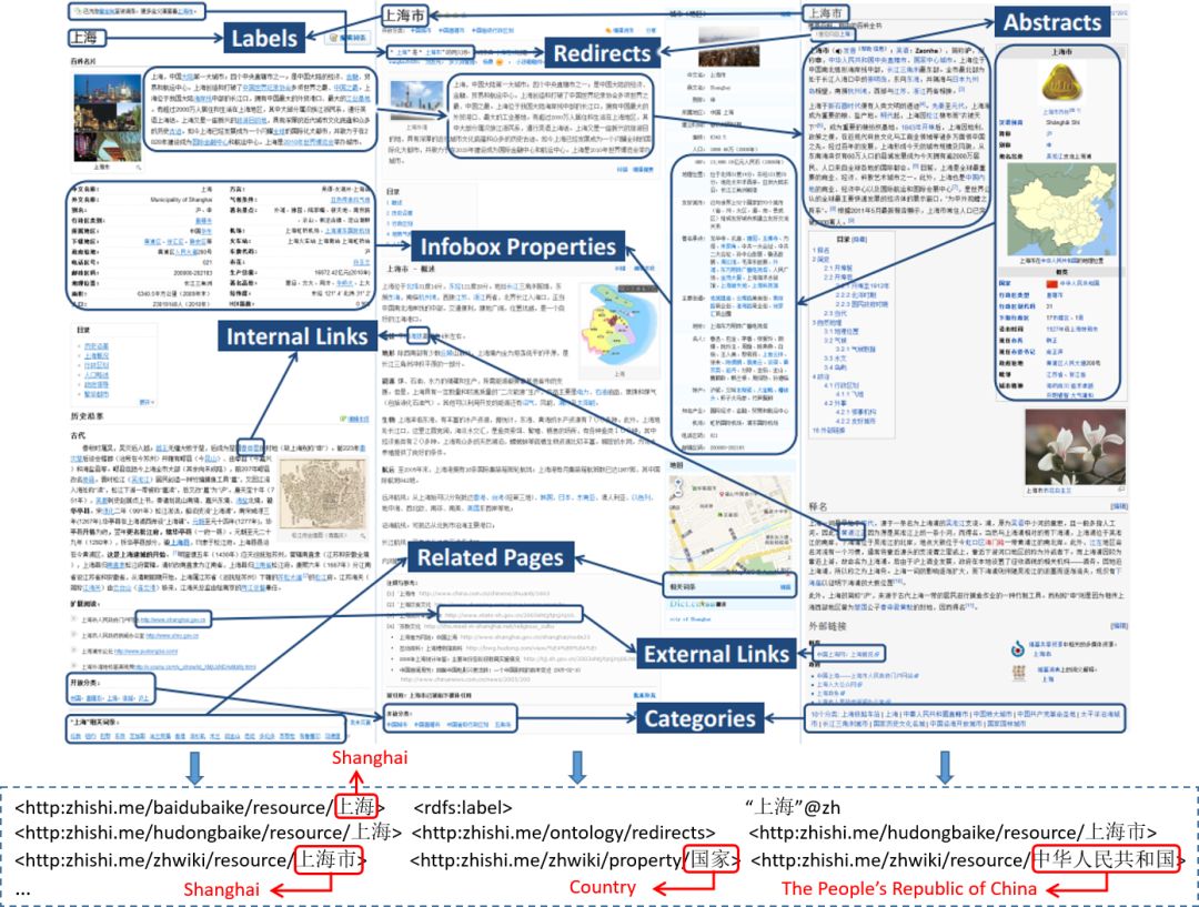 大多数中文知识图谱都是从各种资源中提取知识的。例如Zhishi.me、CN-DBpedia和XLORE从百度百科、互动百科和中文维基百科中提取知识。Linked Open Schema中的类别和标签是用不同语言从不同类型的社交网站中提取的。因此,有必要对这些异质知识进行集成。现有的中文知识图谱以知识链接和知识融合两种方式集成知识。