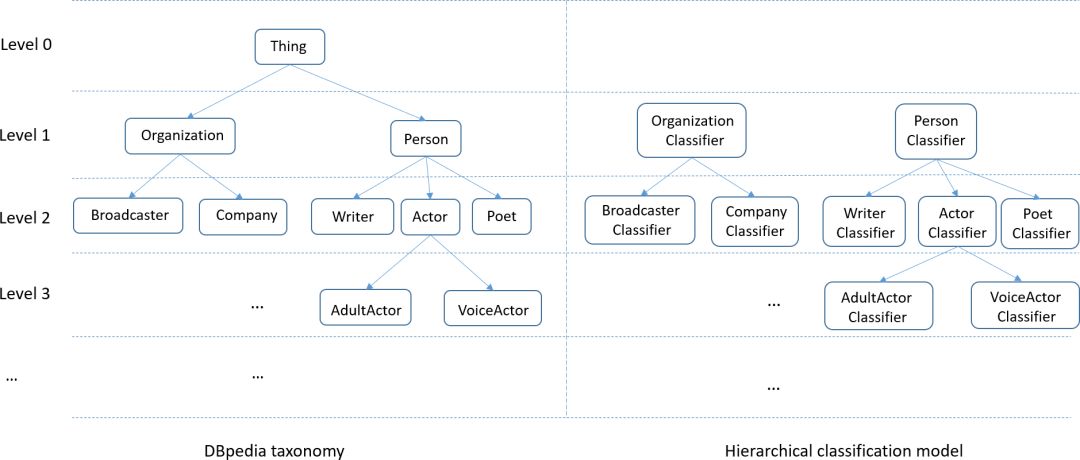 当使用此模型预测给定实体的类型时,它将遍历DBpedia分类法以自顶向下的方式搜索此实体的类型。它首先访问第一级中的类型该分类法是根节点“Thing”的子类型,并将它们添加到候选类型集中。然后,对于每个候选类型,该方法运行该类型的分类器来测试给定实体是否属于这种类型。如果结果为真,则将其所有子类型添加到候选类型集中。当不能处理更多的候选类型时,流程结束。所有类型,它们被分类为对于此过程中给定的实体为true,则作为其类型附加到该实体。