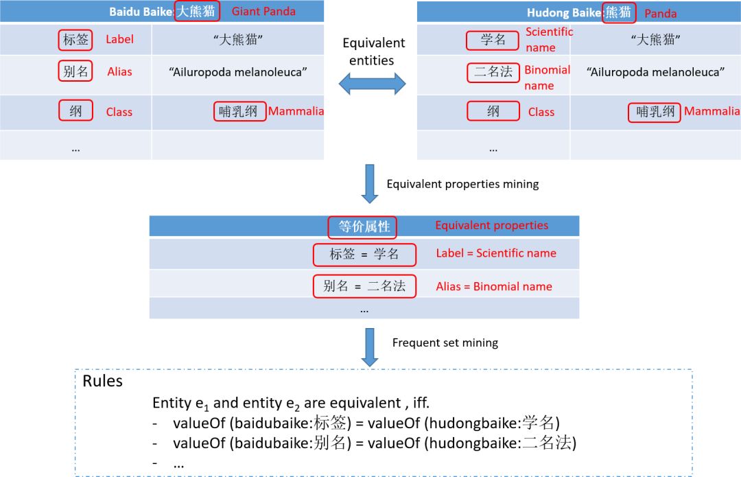 在该方法中,利用owl:sameAs关系链接的少量现有等价实体及其属性作为种子,挖掘更多等价实体。对于每一对存在的等价实体,该方法首先尝试从它们中挖掘等价属性。然后,通过关联规则挖掘从这些等价属性中挖掘出频次集,每个频次集由若干对等价属性组成。挖掘出的频次等价属性集用于构建匹配规则,并应用于整个数据集以发现新的等价实体。例如,在图7中,百度百科中的属性“标签(Label)”等同于互动百科的属性“学名(Scientific name)”,和百度百科的“别名(Alias)”相当于互动百科的“二名法(Binomial Name)”。如果等价属性集合(如上述的等价属性对)是一个频次的集合,这意味着它也可以从许多其他等价中挖掘出来实体,则将用于构造匹配规则。图7也给出了匹配规则的一个例子,当且仅当频次集中对应的等价属性的值都相等时,实体e1和e2才是等价的。