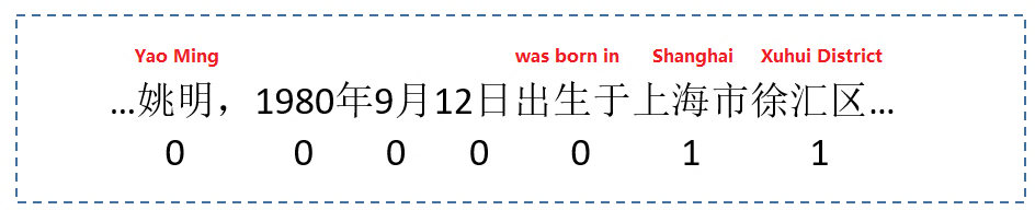 Xu等人提出了一种混合的长短时记忆递归神经网络框架从自由文本中提取知识,可以使用这种方法在CN-DBpedia对消息盒的进行补全任务。CN-DBpedia将消息盒补全任务视为从与给定实体对应的文章中提取给定对主语和谓语的对象。该方法将提取问题建模为一个seq2seq的学习问题。输入是一个包含令牌的句子,输出是每个令牌的标签。标签是要么为1,要么为0,预测令牌是否为谓词对象的一部分。例如,图9中的句子取自与百度百科中的实体“Yao Ming”对应的文章。“出生地”的提取者将把“上海”和“徐汇区”标注为“姚明”的真实名称。为了缓解人力的负担,这种方法也采用了远程自动监督的方法构造训练数据。它可以构造能够表达消息盒中的事实句子作为训练数据。例如,如果< Yao Ming, Height, 2.29 m >出现在姚明的消息盒中,则该方法将造句“姚明的身高是2.29米”,并在句子中正确地标注宾语。为了涵盖尽可能多的有用信息,这种方法训练了单词的混合表示,输入令牌序列中每个令牌的短语和类型。然而,训练是长期的短期的记忆递归神经网络模型由于需要大量的参数,需要更高的时间复杂度来估计。