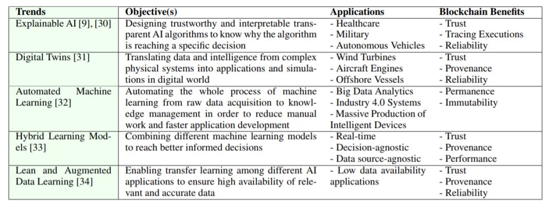 上表描述了最新AI应用趋势包括:可解释人工智能XAI,数字双胞胎仿真,自动机器学习、混合学习模型,增强数据学习等。使用区块链可以增强可信性、可靠性以及性能。