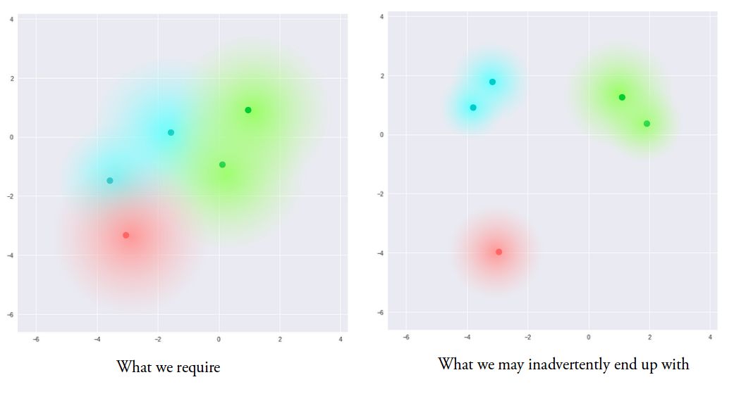 现在,使用纯粹的KL损失导致潜在空间的编码密集地分布在潜在空间的中心附近,几乎不考虑临近编码之间的相似性。 解码器认为从这个空间不可能解码出任何有意义的东西,因为它确实没有任何意义。