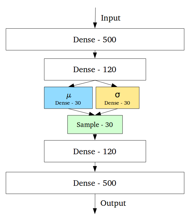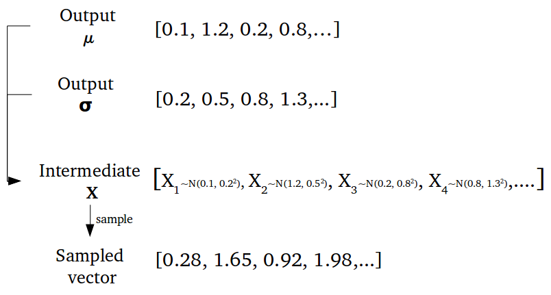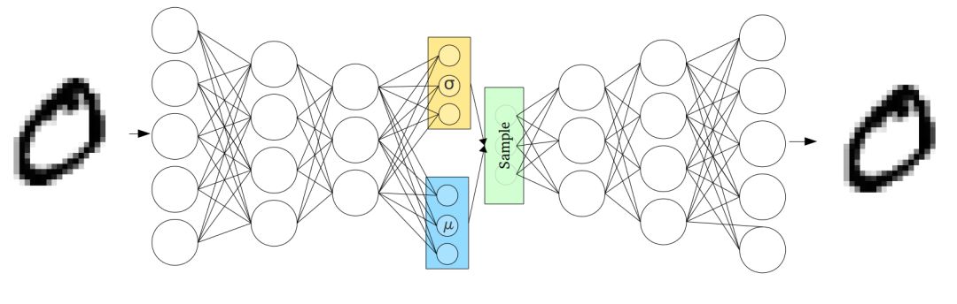 它们构成了长度为n的随机变量向量的参数,μ的第i个元素和σ是我们抽样的第i个随机变量X i的平均值和标准差,并用它们获得采样编码,然后传给解码器: