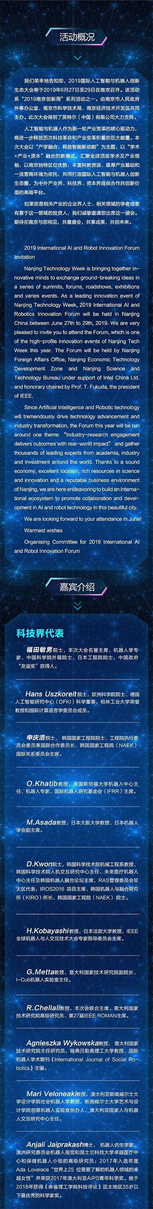 本次大会立足南京市“121”战略实施与国际化建设新成就,瞄准人工智能与机器人学研领域世界领先国家,开启以南京为中心的全球学研网络布局。中科院外籍院士、世界电气电子工程师协会全球主席福田敏男教授,欧洲科学院院士、德国人工智能研究中心科学董事Hans Uszkoreit教授,韩国工程院院士、工程院执行委员会委员兼国际合作委员长申庆浩教授、美国斯坦福大学机器人中心主任、国际机器人研究基金会主席奥萨玛教授、意大利国家技术研究院副院长G.Metta教授、澳大利亚新南威尔士大学社会机器人学Mari Veloneaki教授等40余位国外著名专家将分享全球顶尖学研成果,推动南京成为国际人工智能与机器人学研巅峰城市。