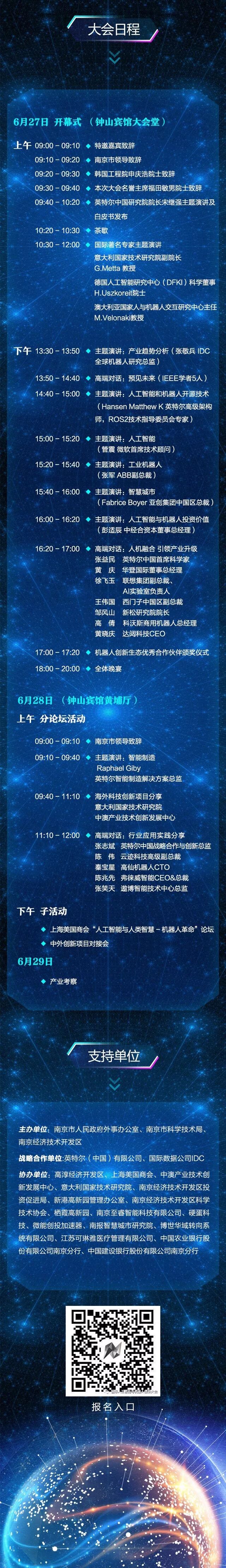 本次大会立足南京产业圈对吸收新技术、培育新动能的现实需求,引入英特尔、微软、西门子、博世、联想、ABB、新松机器人等全球业内头部企业,将围绕全球机器人产业趋势分析、智慧城市建设、人工智能与机器人投资价值、人机融合智能科技助力产业升级等主题展开对话,发布中国人工智能与机器人产业发展白皮书,展示世界首位机器人公民——Sophia、服务型智能柔性机器人及系列人工智能与机器人“黑科技”,助力南京本土企业对接国际最新学术、技术成果。