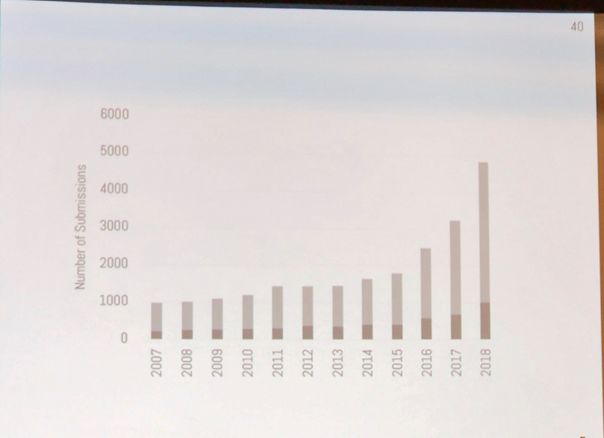 【导读】人工智能领域顶会 NeurIPS 2018 于当地时间 12 月 2 日-8 日在加拿大蒙特利尔举行,2016 年有 5000 人注册参加该会议,2017 年参会人数飙升至 8000,今天参会人数再创新高达到了8400人。 大会总共有4800篇论文提交,录用率21%。