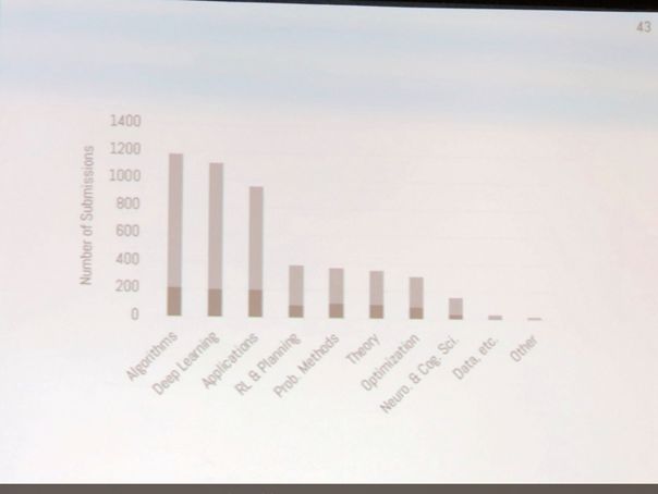 下图是不同领域的投稿录用情况, 可见算法关注度超越深度学习, 之后依次是:应用,强化学习,概率方法,理论,优化方法,神经和认知科学,数据科学等等