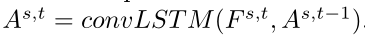 由于人与对象交互具有时间信息,因此邻接矩阵应考虑先前状态。文中采用Conv LSTM在时域中对连接函数L(·)进行建模。在时间t,连接函数以F^{s,t}作为输入特征并且先前的邻接矩阵A^{s,t-1}作为隐藏状态: