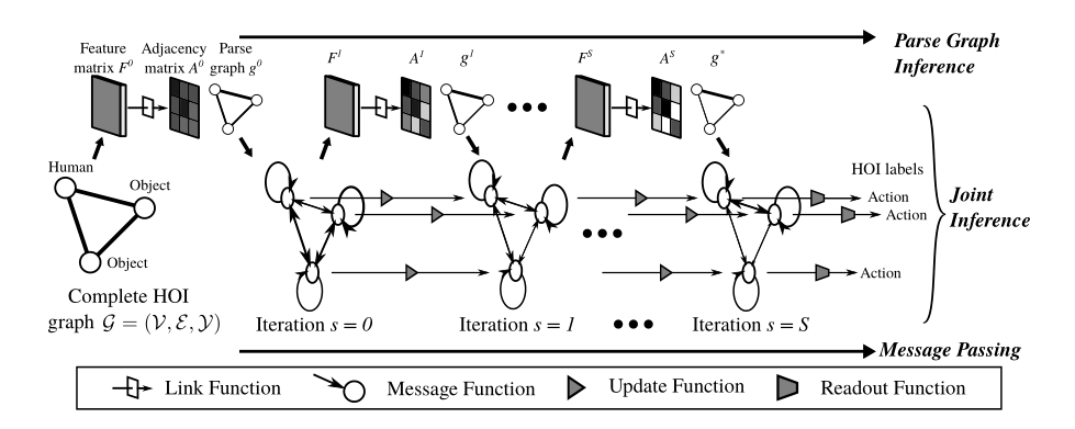 给定一个包含人和对象所有可能关系的完整HOI图,CPNN的目标是通过保留有意义的边并标记节点来自动推断解析图。