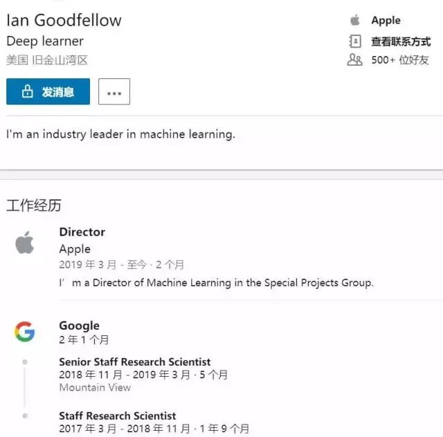 日前,Ian Goodfellow 的 LinkedIn 账户已经更新他的最新职位信息: