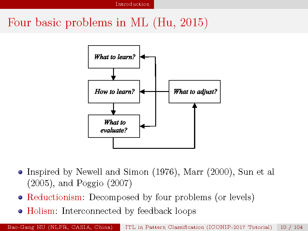 在大部分的机器学习与模式识别研究中,关注更多的是”how to learn”与”what to evaluate”的问题,但是”what to learn”以及”how to adjust”的问题却很少被研究,而他们也是机器学习更加智能的关键,如果学习目标是错误的,即使再好的学习方法也无法达到目标;而不知道如何调整机器学习组件,也就无法提升机器智能的层次。