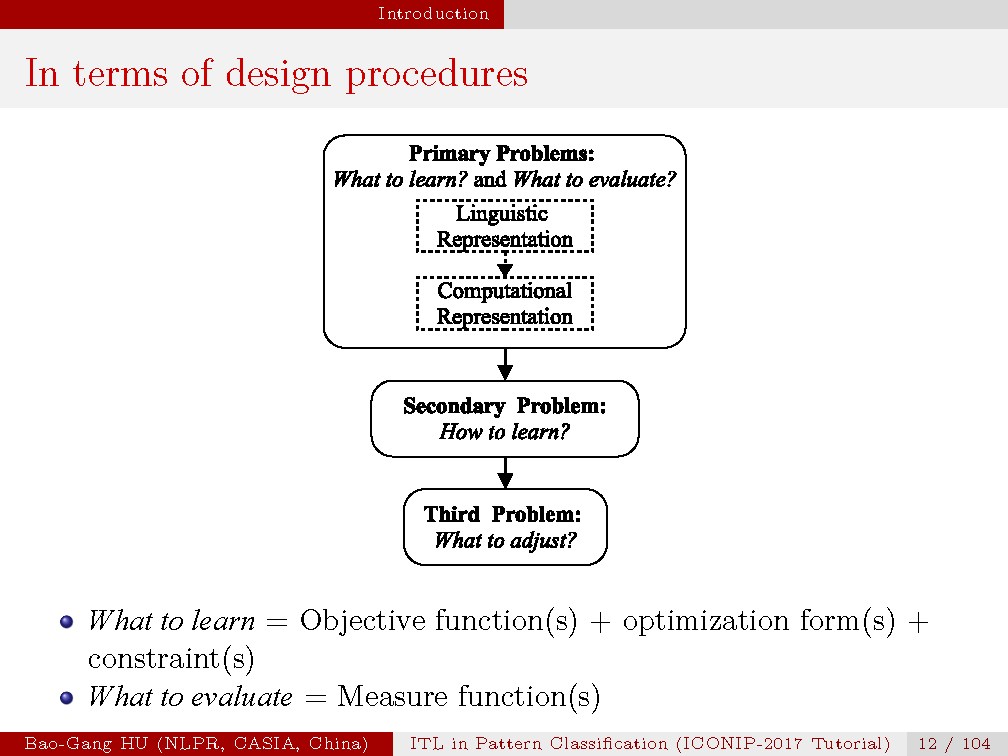 “what to learn” 是指学习目标的选择,要学习什么以及选择什么度量方式, 它通常由目标函数,优化方法与约束条件组成;”what to evaluate” 是指度量函数;这两个问题在计算表达与可解释层面组成了机器学习的初级问题;在这个基础上,”how to learn”是次级问题,它表示在满足所有约束条件下达到学习目标的学习过程设计与实现;第三级问题是”what to adjust”, 体现了机器在实现智能动态进化或成长的功能。