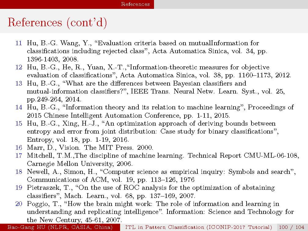 胡包钢老师是机器学习与模式识别领域的知名学者,1993年在加拿大McMaster大学获哲学博士学位。1997年9月回国前在加拿大MemorialUniversity of Newfoundland, C-CORE研究中心担任高级研究工程师。目前为中国科学院自动化研究所研究员。2000-2005年任中法信息、自动化、应用数学联合实验室(LIAMA)中方主任。
